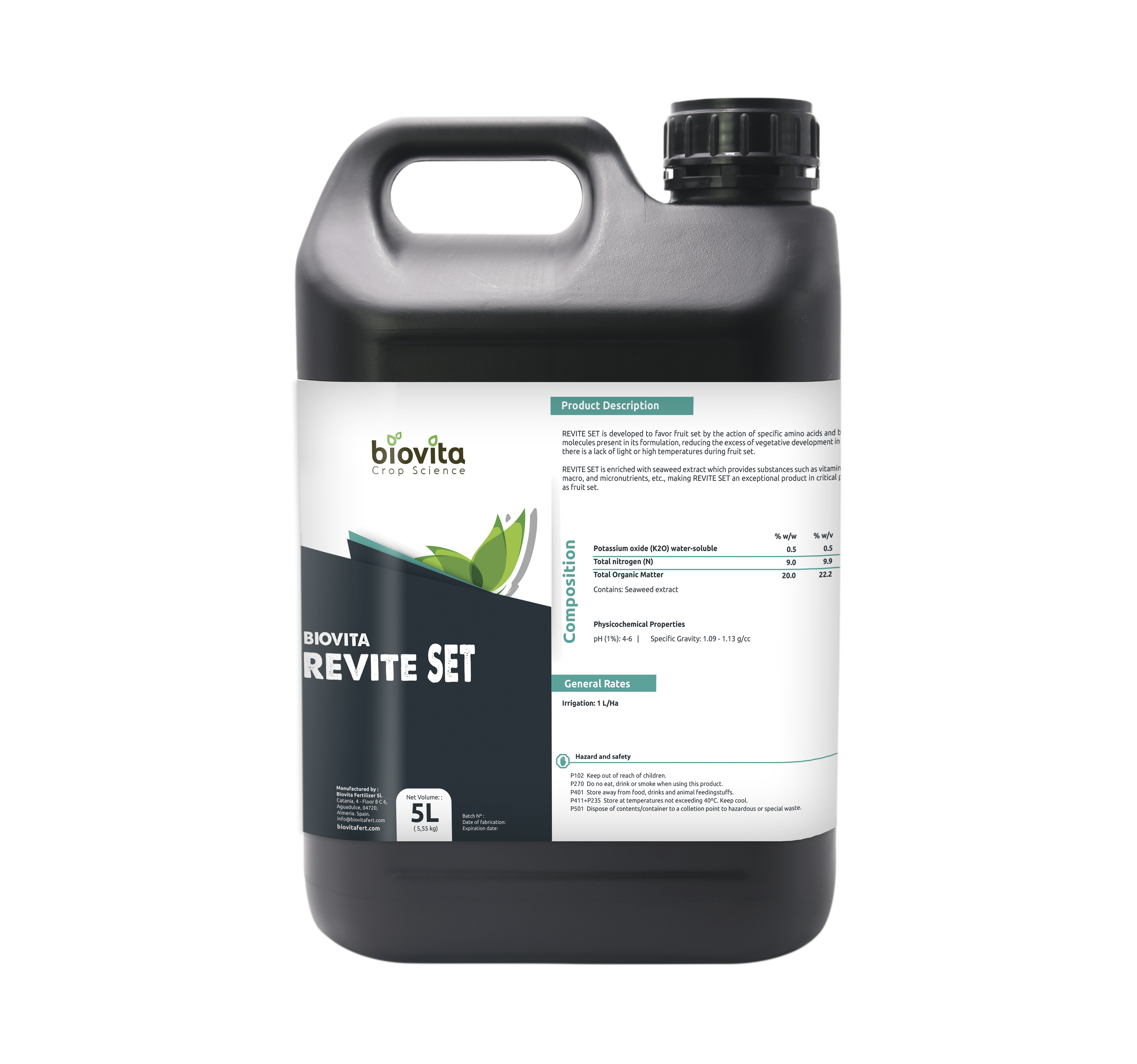 O REVITE SET é uma formulação desenvolvida para favorecer o vingamento dos frutos pela ação dos aminoácidos específicos e das moléculas bioestimulantes presentes, reduzindo o excesso do desenvolvimento vegetativo nas culturas quando há falta de luz ou altas temperaturas durante a fase de vingamento.