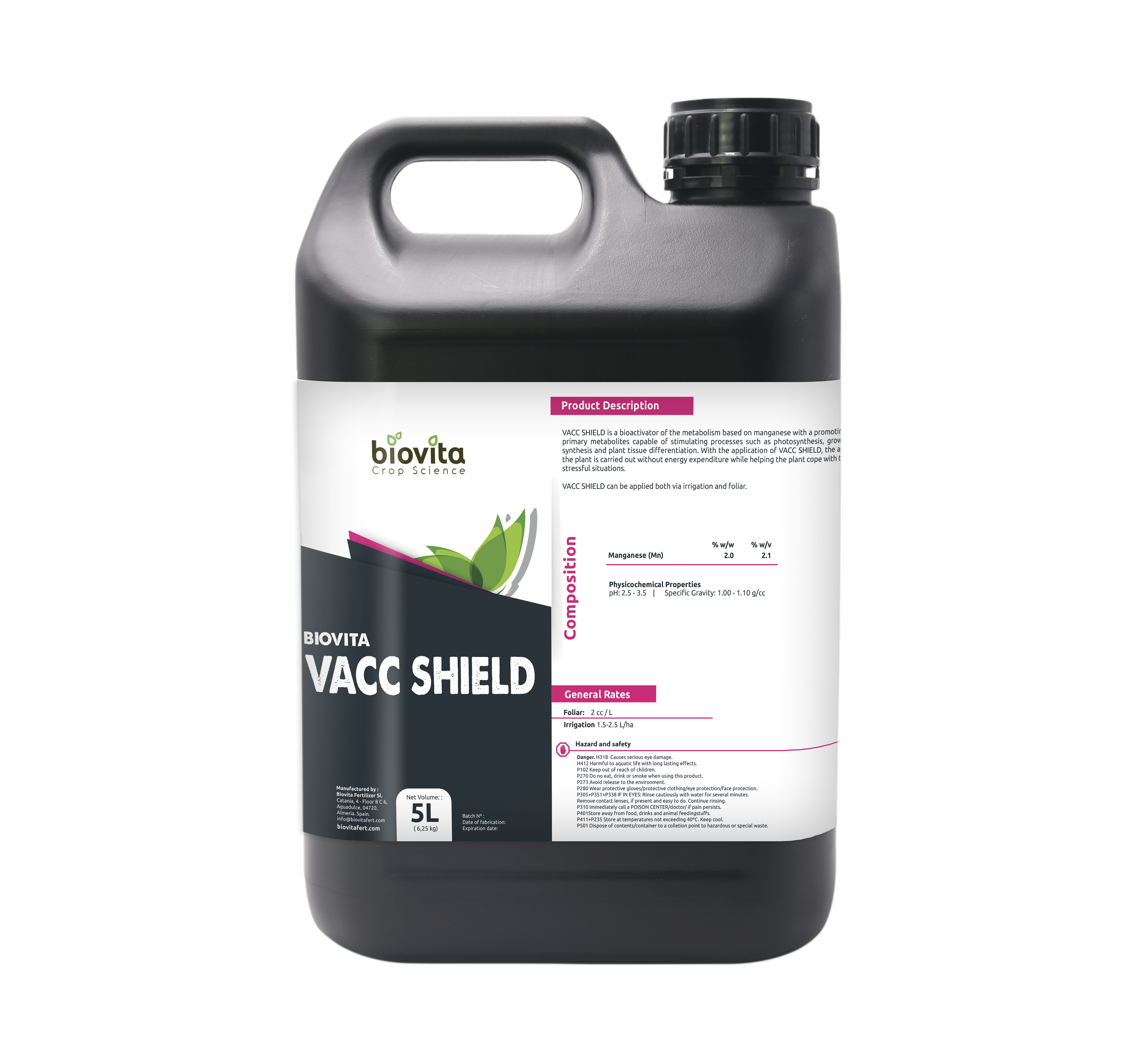 O VACC SHIELD é um bioativador do metabolismo das culturas formulado à base de manganês, com um efeito promotor dos metabólitos primários capazes de estimular os processos como a fotossíntese, o crescimento, a síntese das proteínas e a diferenciação dos tecidos vegetais das plantas.