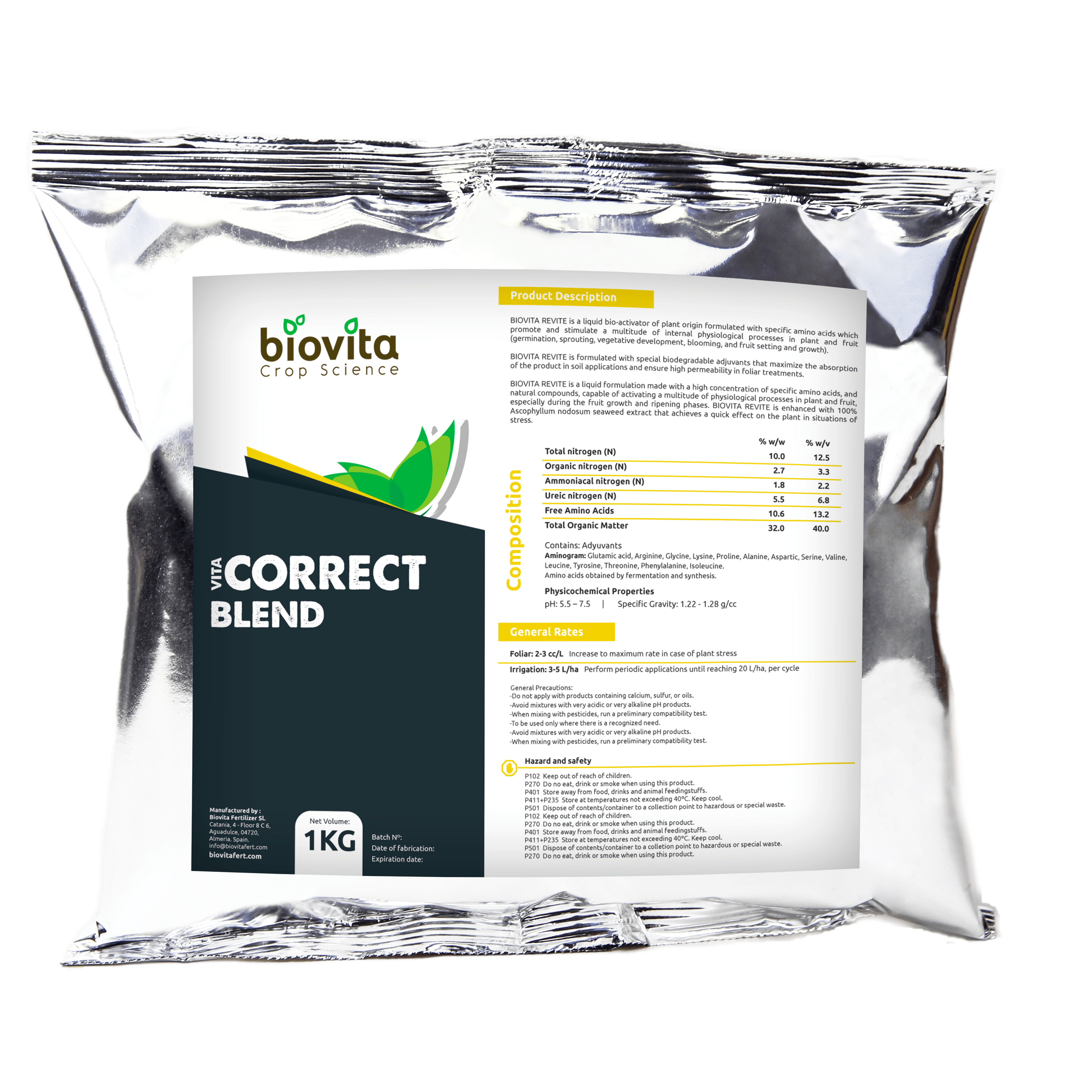 VITA CORRECT BLEND es producto formulado en base a microelementos específicos para mejorar las fases de germinación, enraizamiento y brotación en cualquier tipo de cultivo.
