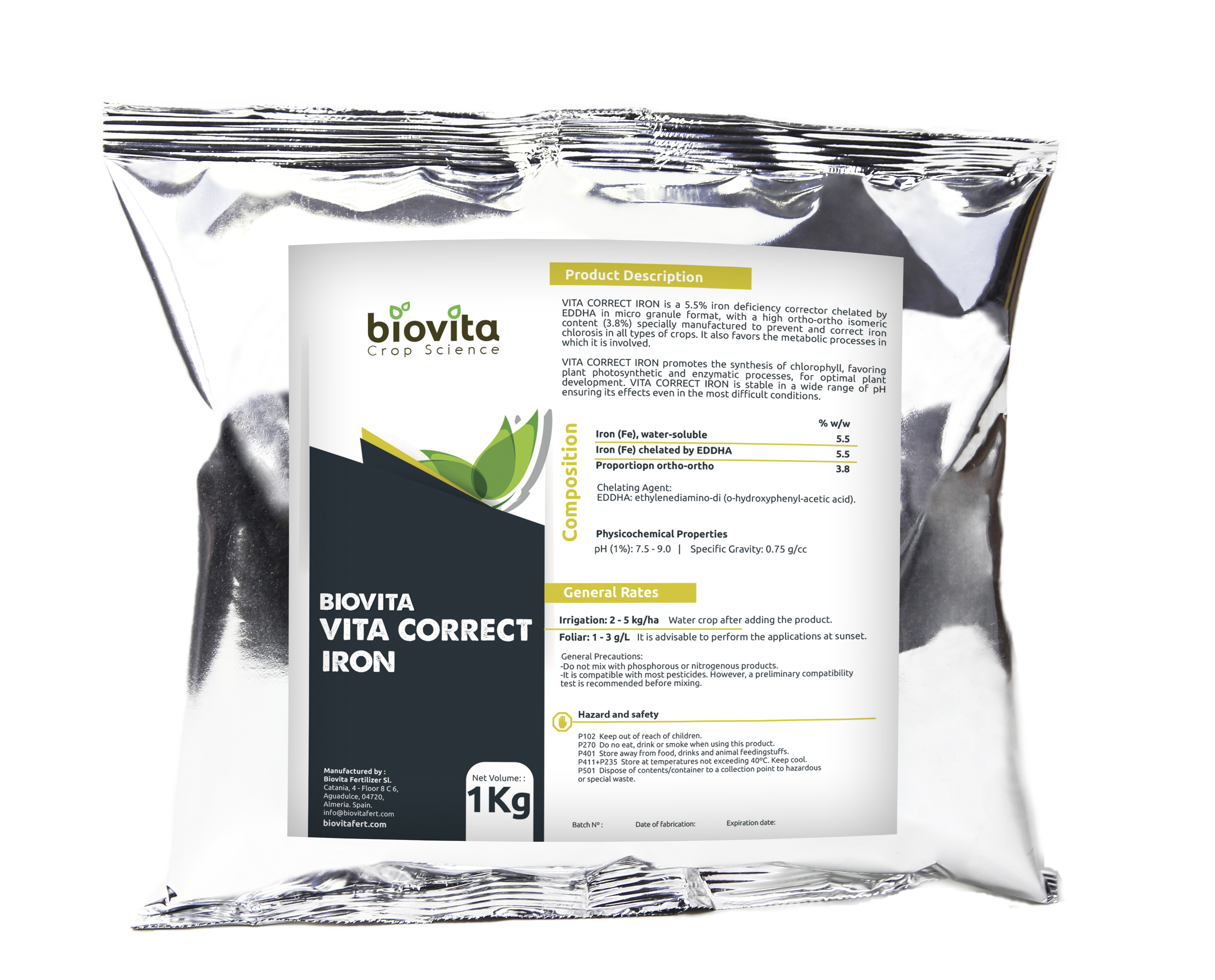 VITA CORRECT IRON es un corrector de hierro quelado al 5,5% por EDDHA en microgránulo con un alto contenido en isomería orto-orto (3,8 %) especialmente fabricado para prevenir y corregir clorosis férricas en todo tipo de cultivos, además de favorecer los procesos metabólicos en los que se ve implicado.