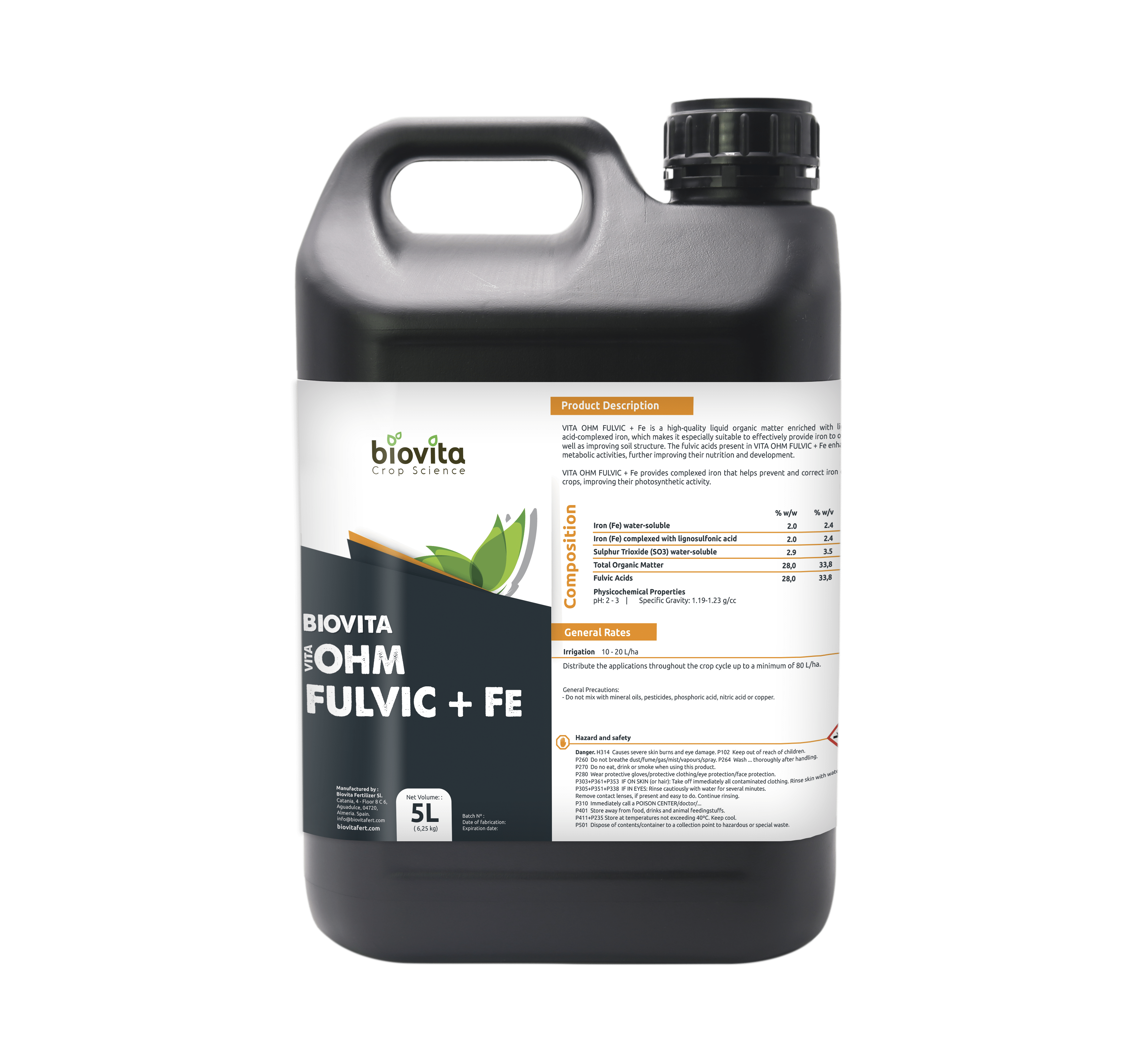 VITA OHM FULVIC + Fe es una materia orgánica líquida de alta calidad enriquecida con hierro complejado mediante ácido lignosulfónico lo que la hace especialmente indicada para favorecer el aporte eficaz de hierro a nuestros cultivos además de mejorar la estructura de los suelos.