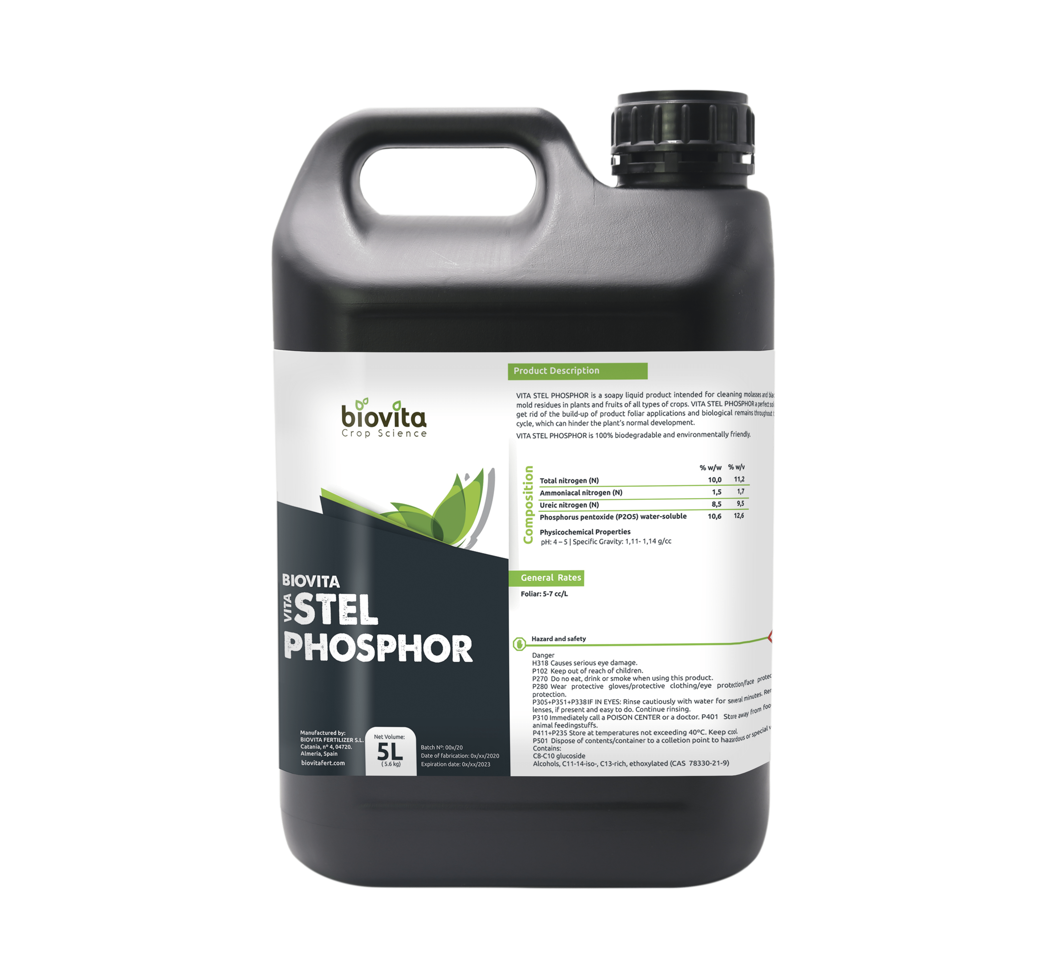 VITA STEL PHOSPHOR est un produit liquide savonneux destiné au nettoyage des restes de mélasse et de fumagine sur les plantes et les fruits de tous types de cultures.